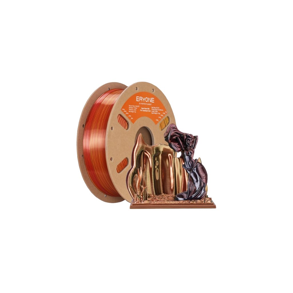 ERYONE Metallic Frenzy je PLA Silk filament s jedinečnou čtyřbarevnou kombinací – černá, červená, oranžová a zlatá. Díky hedvábnému lesku a výrazným barvám je ideální pro tisk designových modelů, dárků i kreativních projektů.