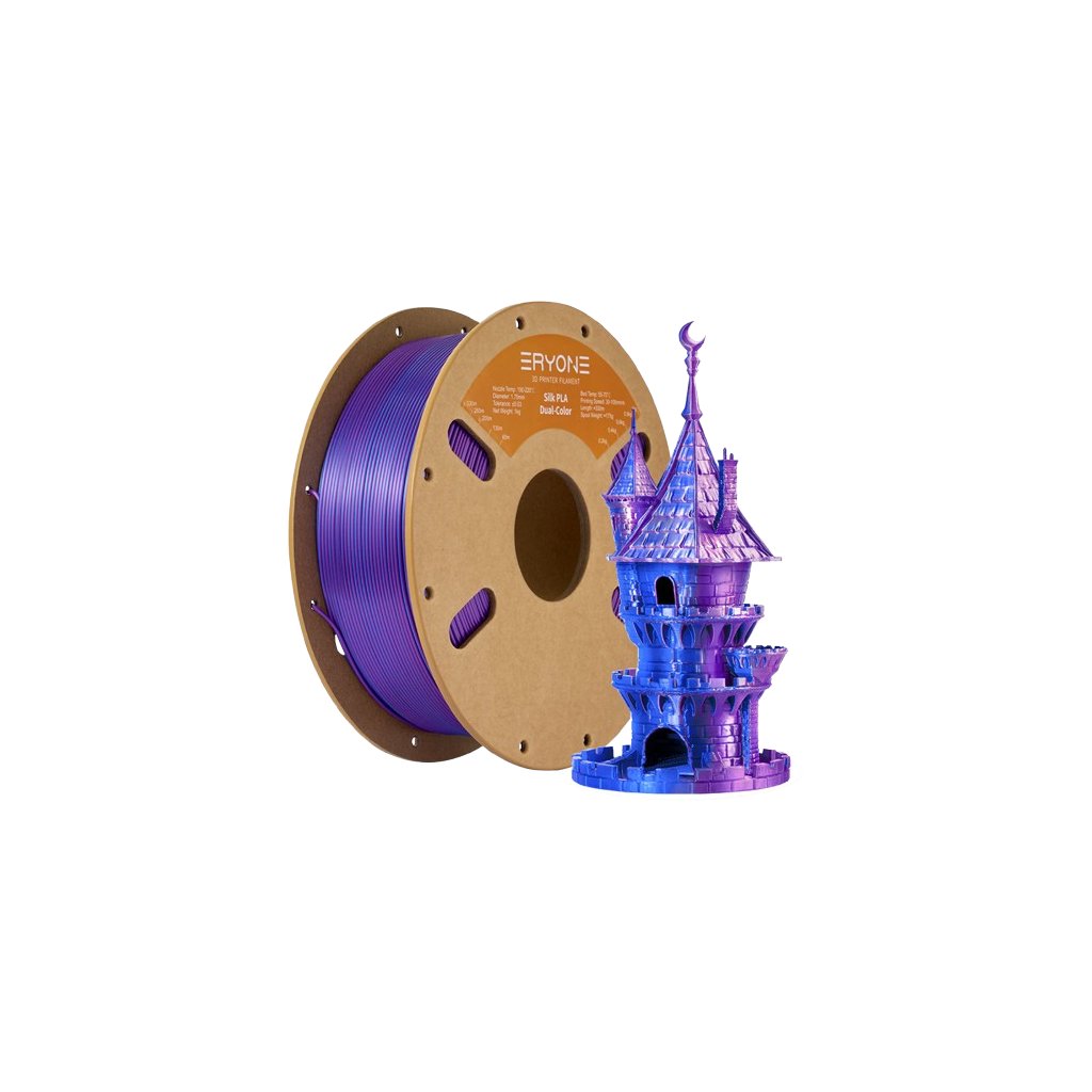 Eryone PLA Silk Dual-Color Blue-Purple je vysoce kvalitní PLA filament s hedvábným leskem a plynulým dvoubarevným gradientem. Spojení modré a fialové vytváří elegantní a zajímavý vzhled, který se mění v závislosti na úhlu pohledu. Ideální pro dekorativní modely, umělecké výtisky a designové prototypy.