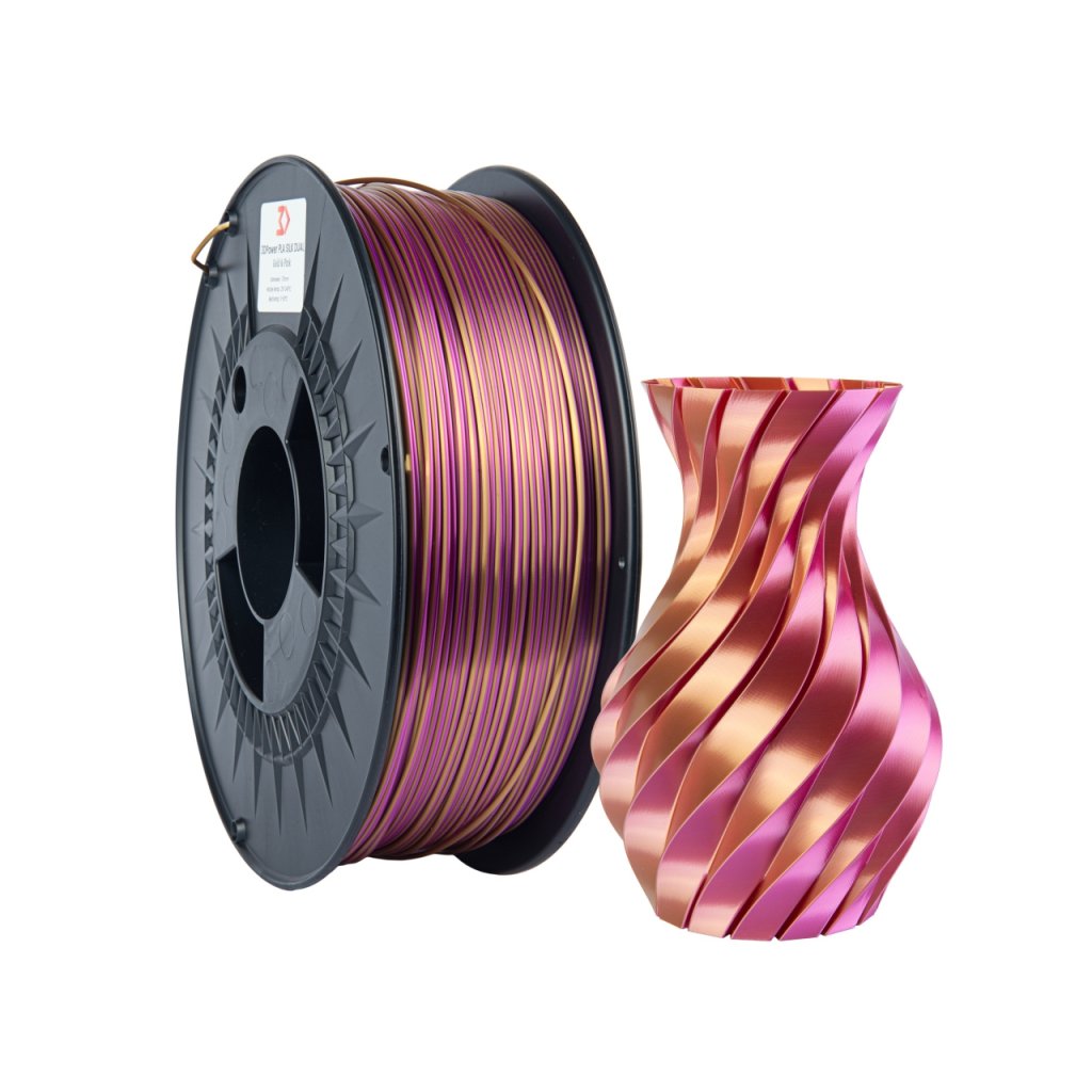 PLA Dual Silk 3Dpower v barevném provedení Gold-Pink je vizuálně atraktivní filament určený pro tisk designových objektů, dekoračních prvků a modelů, u kterých je klíčový vzhled. Filament kombinuje syté barevné odstíny zlaté a růžové v plynulém gradientu, který dodá výtiskům výrazný a moderní vzhled.