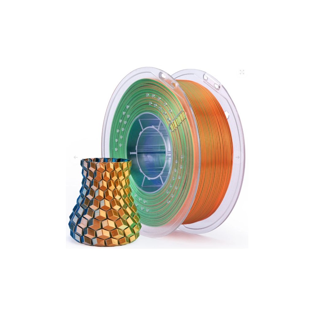 Elegoo PLA Silk Blue-Green-Orange je prémiový PLA filament s hedvábným leskem a jedinečným trojbarevným gradientem mezi modrou, zelenou a oranžovou. Tento exkluzivní efekt dodává výtiskům hladký a vysoce lesklý povrch, který se mění podle úhlu pohledu. Perfektní volba pro dekorativní modely, sochy, umělecké projekty i exkluzivní designové prototypy.